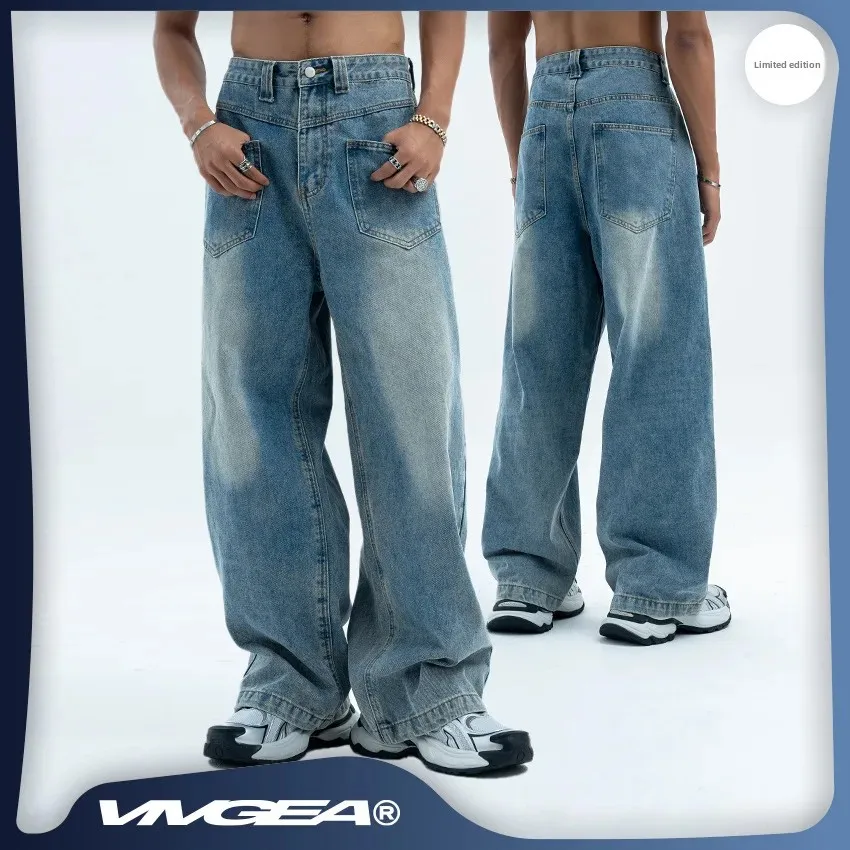 VIVGAE original national trend American retro rear pocket front jeans men and women street hip-hop wide legs high street loose