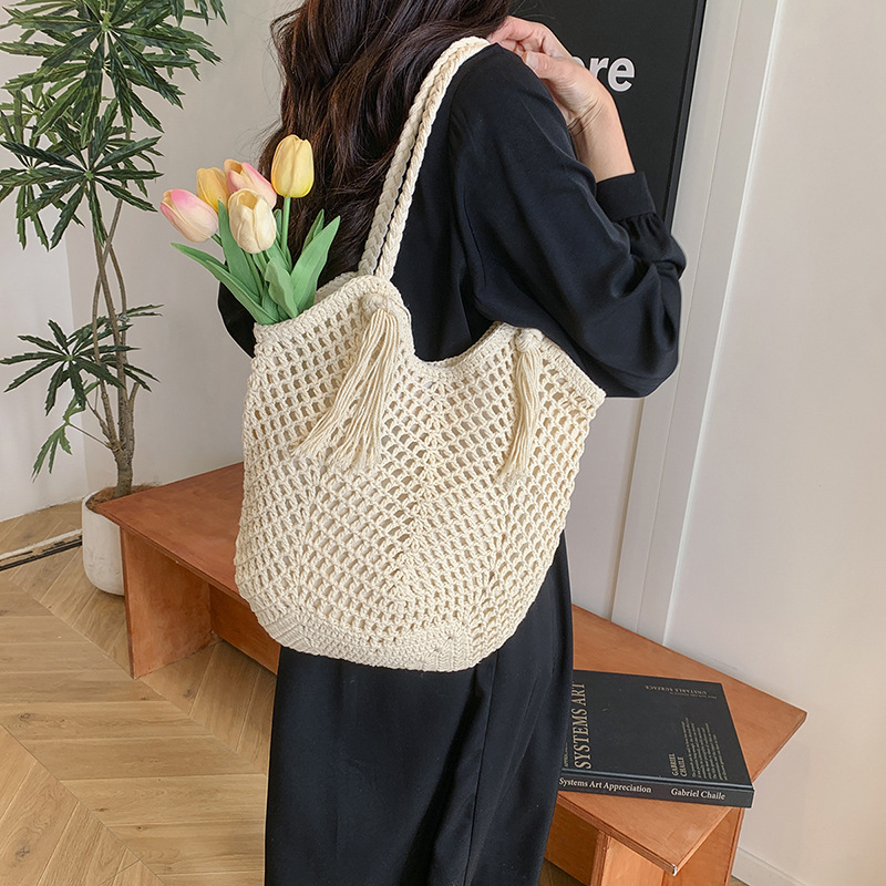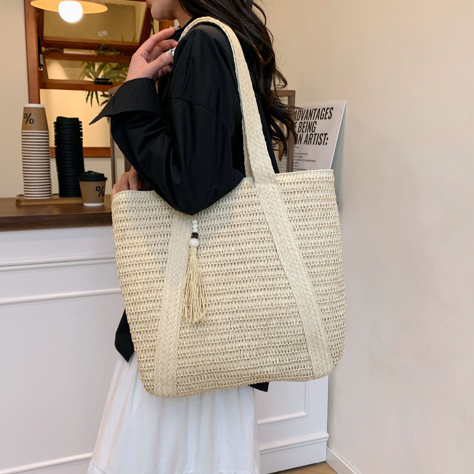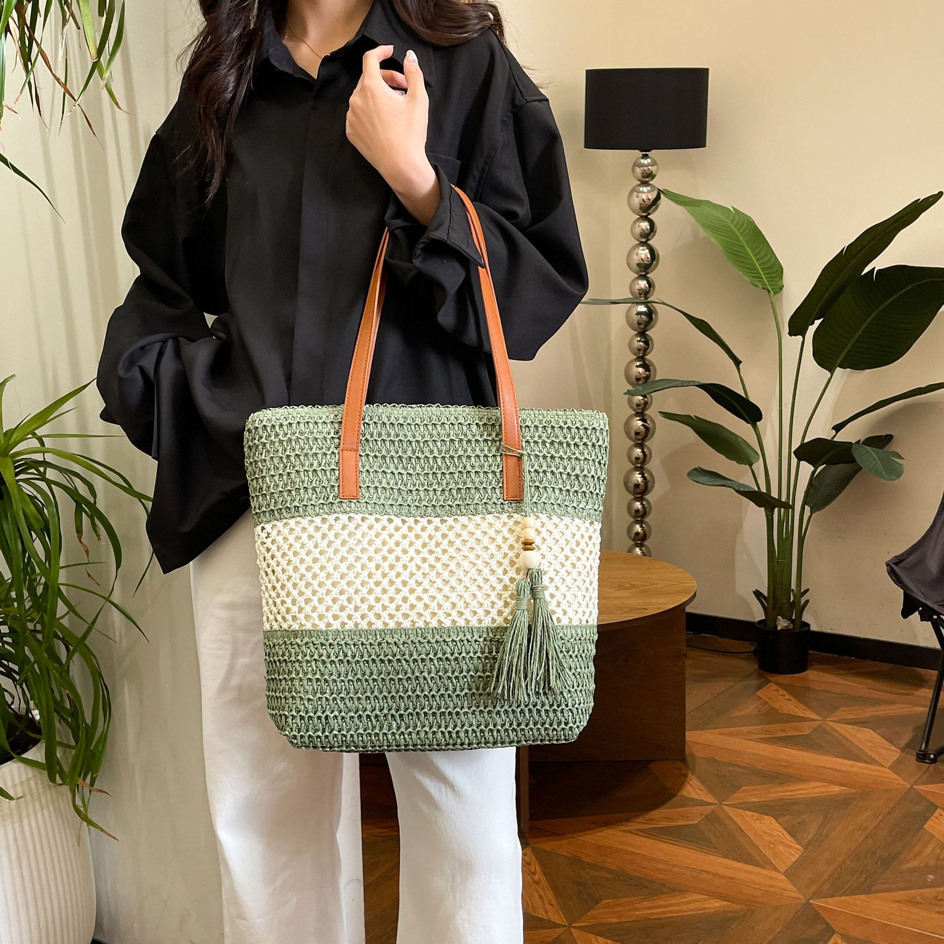 2024 Summer New Retro Women\'s Handmade Woven Bag Color blocked Tassel Wooden Bead Seaside Vacation Straw Woven Bag