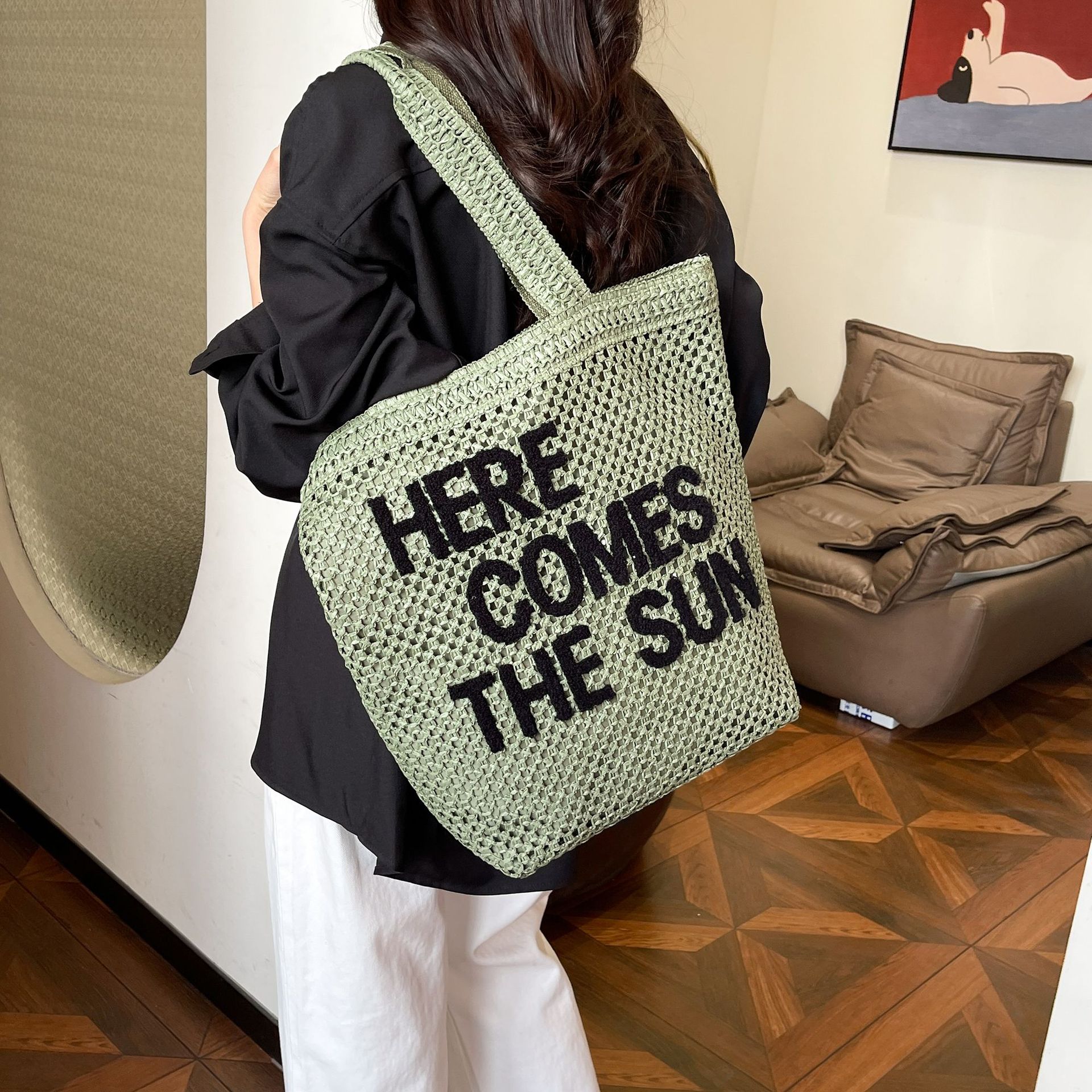 New color-blocked straw bag straw hat set large capacity shoulder bag woven bag high-end beach tote bag