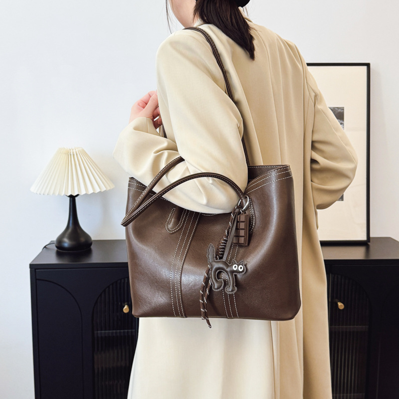 Fashionable single shoulder oil wax leather big bag, retro style, simple mommy bag, trendy tote bag, trendy handbag for women