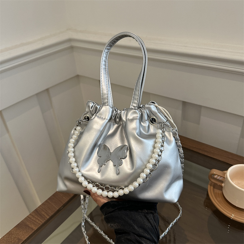 Silver butterfly backpack for women 2024 new trendy Korean fashionable pearl chain shoulder bag