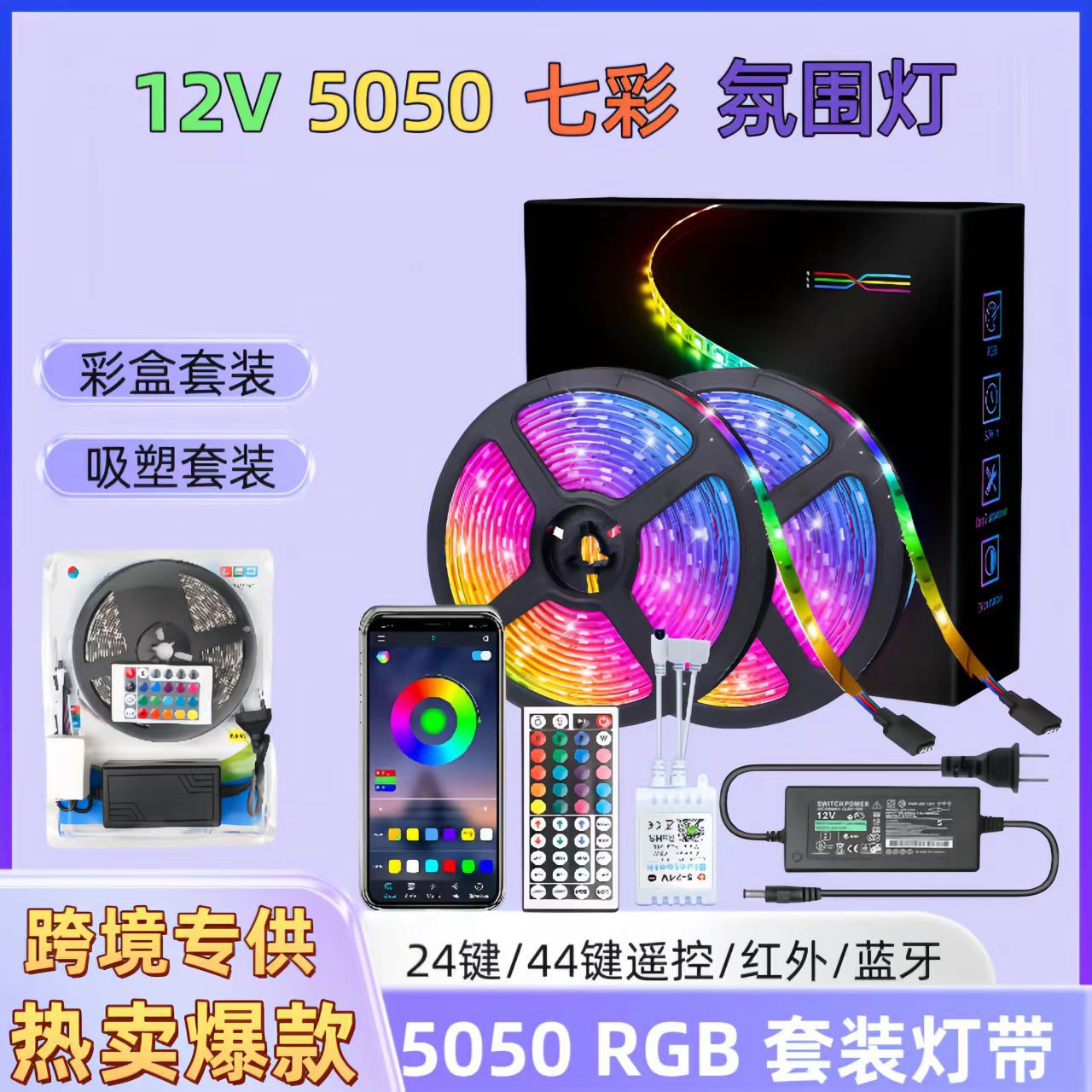 Cross-border e-commerce 5050RGB light strip set 12V colorful LED soft light strip low voltage Bluetooth music decoration atmosphere