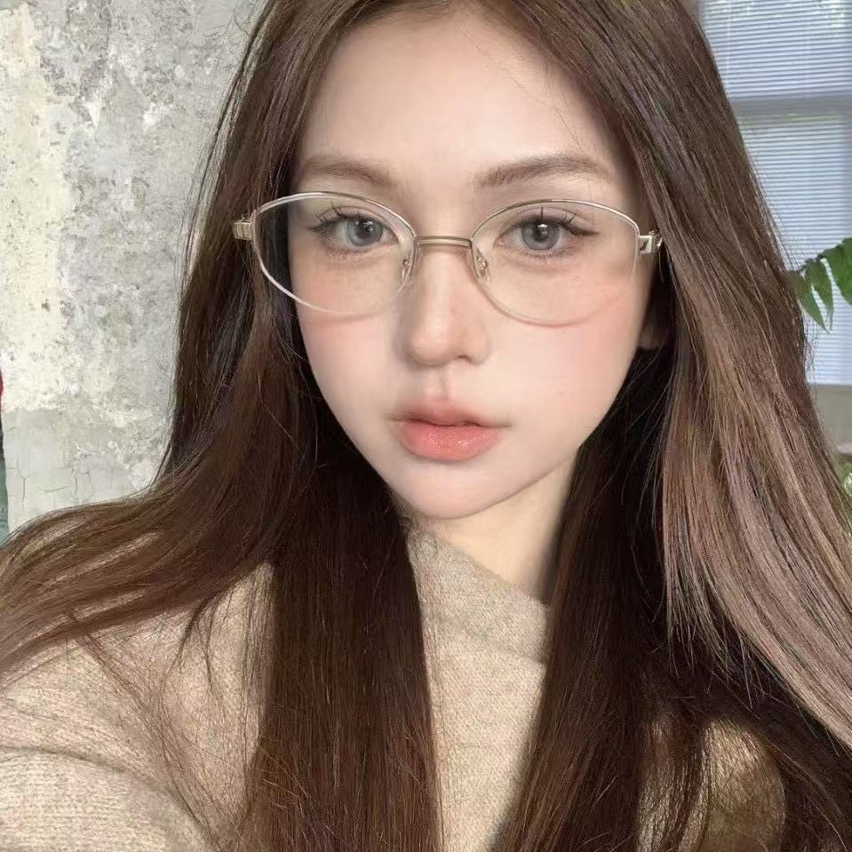 Pure Desire Wind Elliptical Half Frame Metal Flat Mirror Female Round Face Advanced Sensitivity Mirror Frame Can be Paired with Myopia Anti Blue Light Glasses