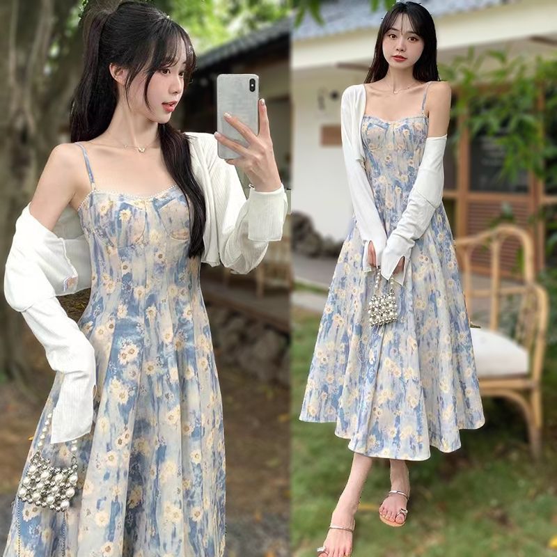 Large size women's French floral dress with suspender, high-end feeling, fat mm coat, medium long skirt, two-piece set, trendy