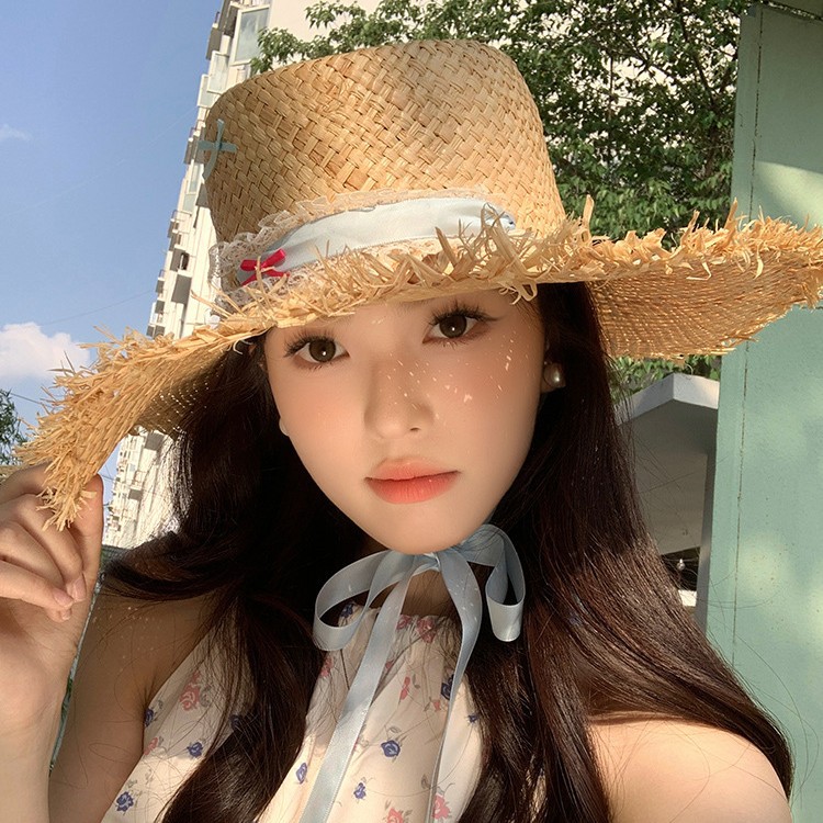 French bow flat top Lafite grass hat for women in summer, with a large brim for beach outings, sun protection, and straw woven hat